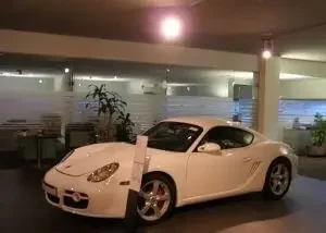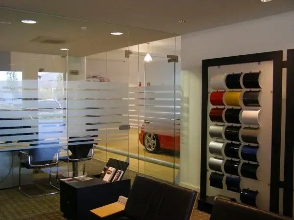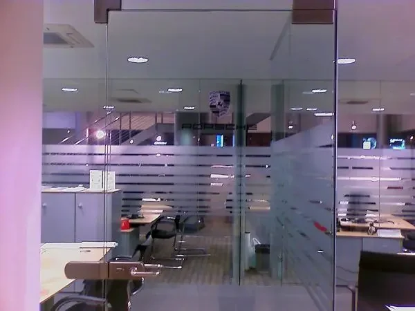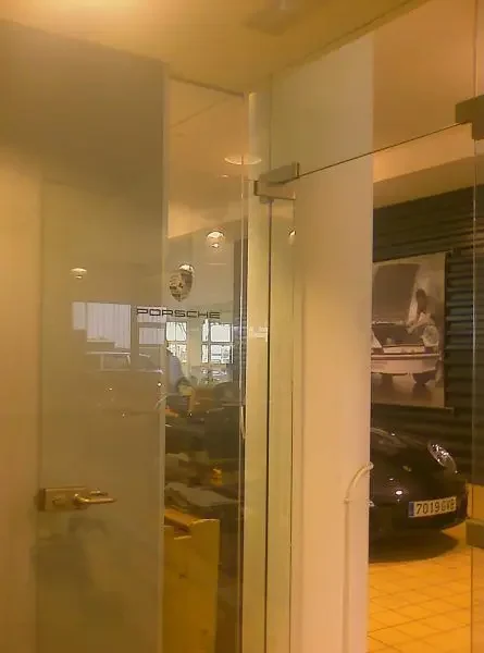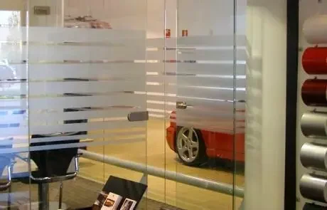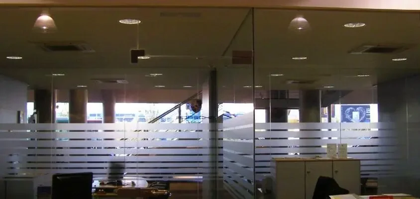 Instalación de vinilo decorativo glaseado a rayas en mamparas de cristal. Realizado para las oficinas del Centro Porsche en Barcelona.