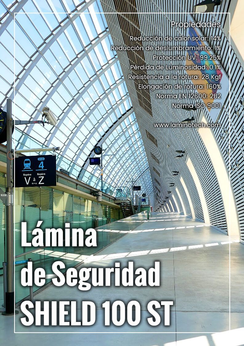 Esta lámina de seguridad Shield 100 ST aplicada al cristal aumenta considerablemente la resistencia del mismo. Tras choques o golpes accidentales, la película adhesiva mantiene el vidrio en su sitio; evitando que salgan despedidos los fragmentos de cristal. De este modo, se evitan lesiones producidas por vidrios rotos y se atenuan los efectos producidos por golpes o explosiones accidentales.