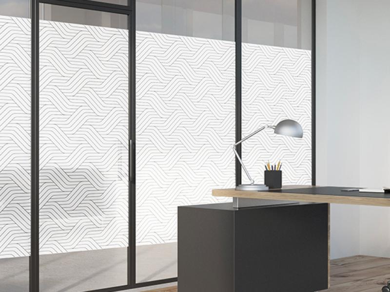 La lámina decorativa Tramas, de color glaseado y transparente, permite visibilidad y dota al espacio de armonía y bienestar.