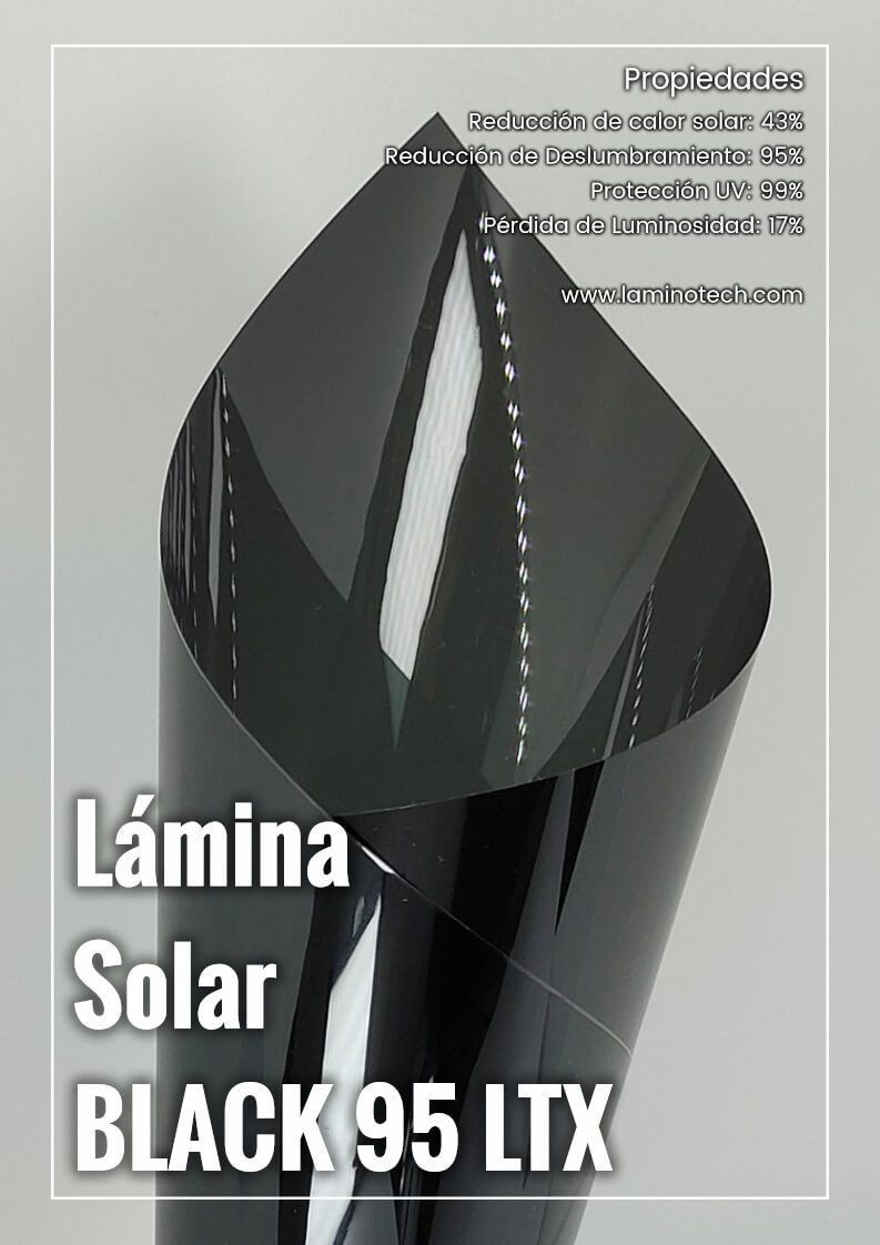 La lámina solar Black 95 LTX es una lámina de alta eficiencia lumínica, con muy alto rechazo de luz visible del 95%. Esta lámina solar también reduce de 2 a 3 grados la temperatura. Perteneciente a la gama de láminas solares tintadas, está especialmente diseñada para reducir el deslumbramiento.