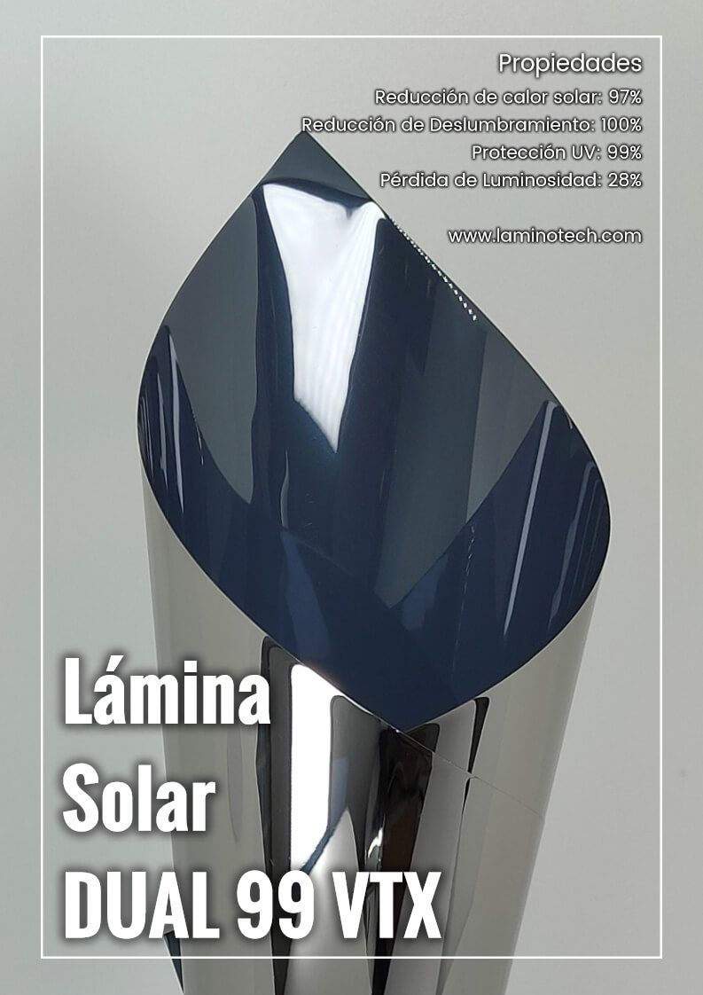 Esta lámina solar Dual 99 VTX es una versión extrema diseñada para obtener la máxima eficiencia térmica y lumínica. Tiene como desventaja la pérdida de luminosidad del 28%, que produce un oscurecimiento elevado del espacio interior.