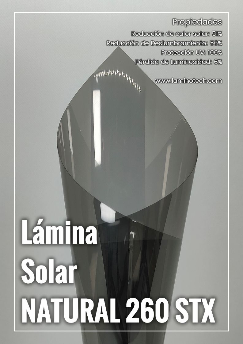 La lámina solar Natural 260 STX pertenece a la gama de láminas solares tintadas. Se caracteriza por una alta eficiencia térmica, con un rechazo de calor moderado y aspecto natural color café. Su tintado se obtiene por Tecnología Sputter, tecnología de última generación que permite una mayor durabilidad y aspecto inalterable a lo largo del tiempo.
