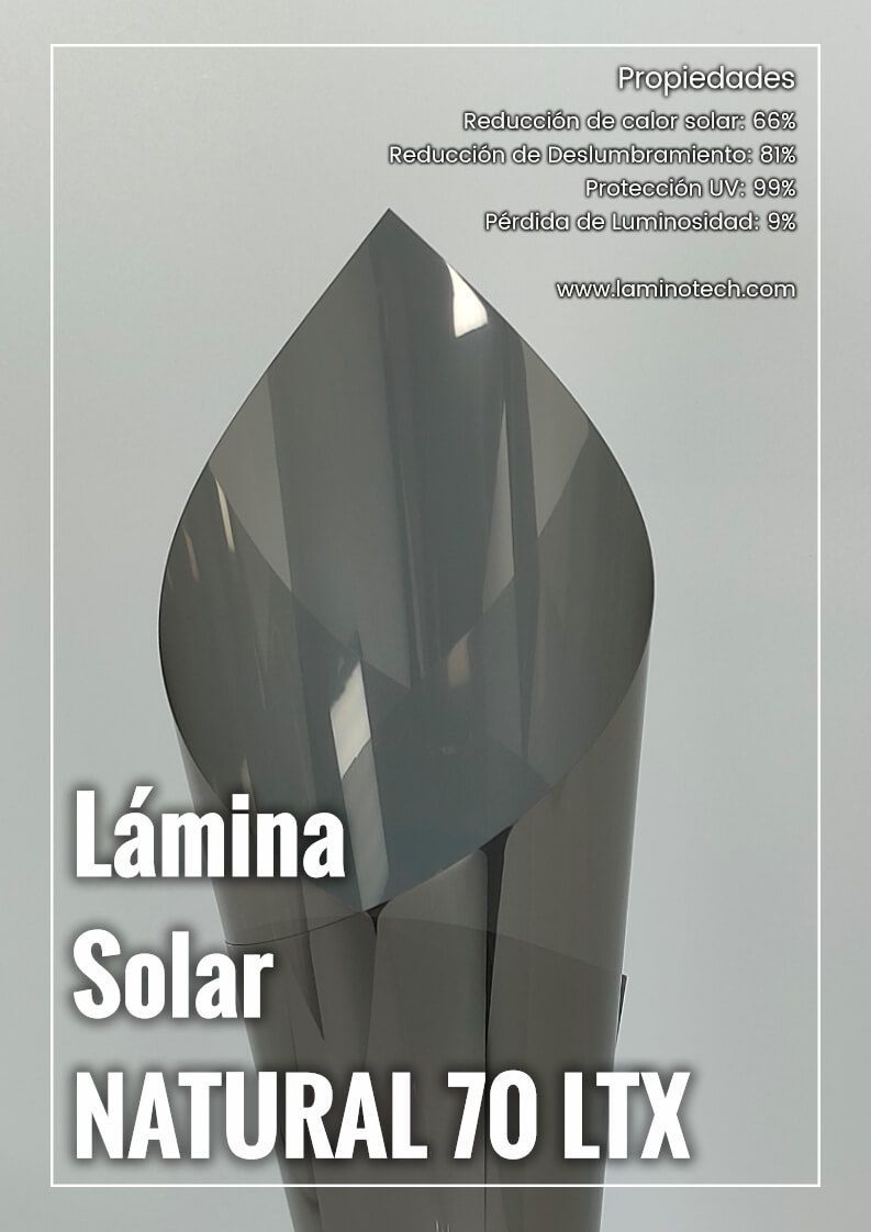 La lámina solar Natural 70 LTX pertenece a la gama de láminas solares tintadas. Se caracteriza por una alta eficiencia térmica, con un rechazo de calor moderado y aspecto natural color café. Su tintado se obtiene por Nanotecnología, a través del proceso de «polvo de tierra»; tecnología de última generación que permite una mayor durabilidad y aspecto inalterable a lo largo del tiempo.