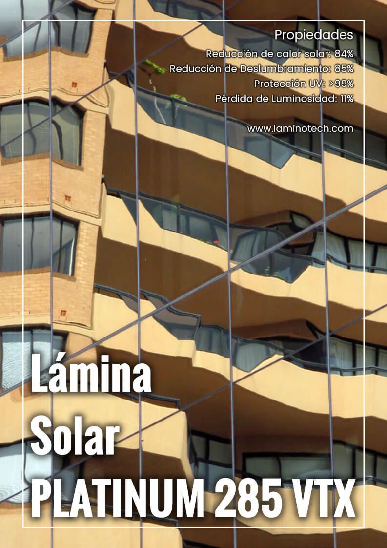 La lámina solar Platinum 285 VTX es una lámina de gama Platinum de segunda generación, con calidad mejorada y garantía de hasta 10 años en instalación vertical y 7 años en horizontal. La mejor lámina para evitar el calor, manteniendo una adecuada transmisión de luz visible. Perteneciente a la gama de láminas solares metalizadas reflectivas para aplicación por exterior. Son la opción más popular para espacios que necesitan una reducción de calor significativa y un retorno de inversión rápido.