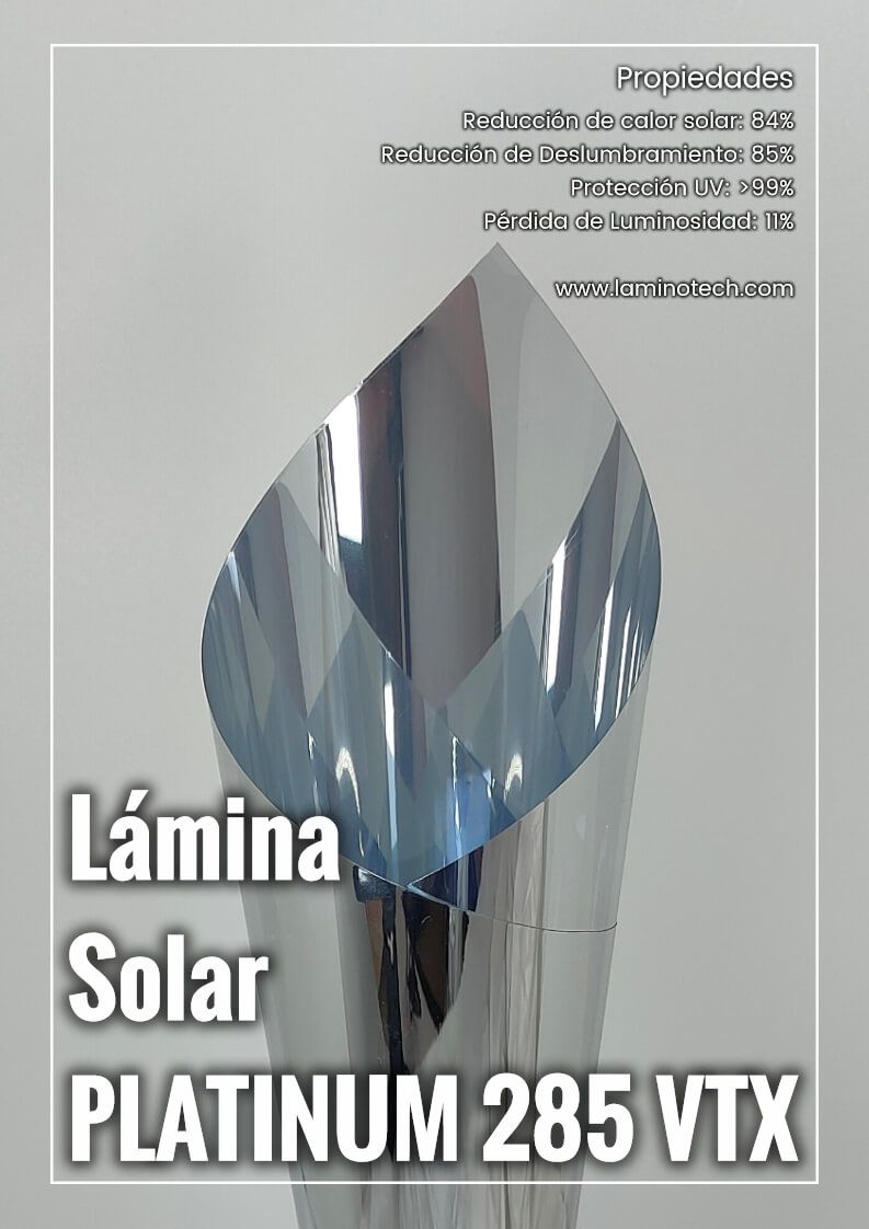 La lámina solar Platinum 285 VTX tiene una protección solar muy alta del 86%, con una apariencia plata espejada fuerte. Su rechazo de calor IR es también muy alto, del 94%.