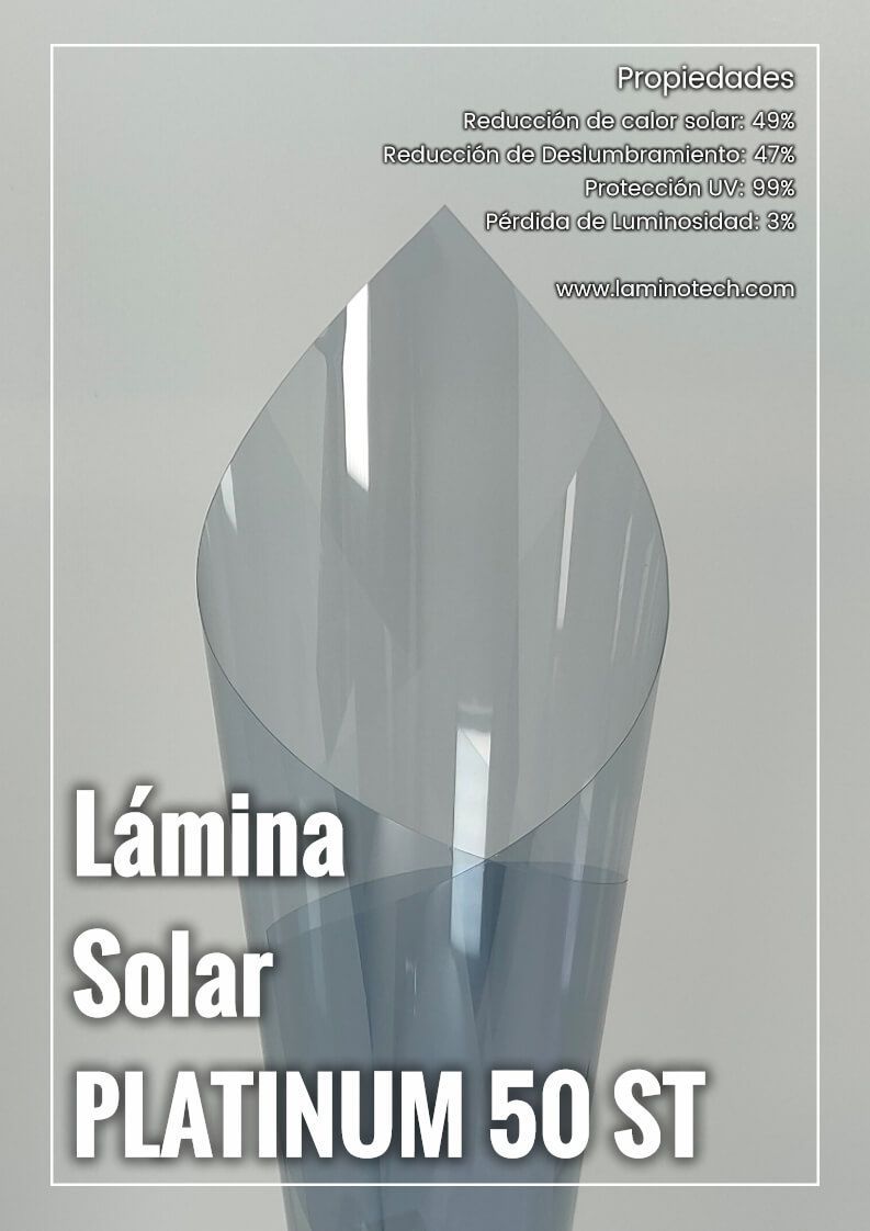 Esta lámina es el modelo más suave perteneciente a la gama de láminas solares reflectivas. Le proporcionará una protección solar moderada, una transmisión de luz muy alta y una tonalidad del vidrio suave. A pesar de ello, la lámina solar Platinum 50 ST tiene una reducción de calor solar de un 49% y un rechazo infrarrojo del 73%, lo que se traduce en una incuestionable disminución de calor.