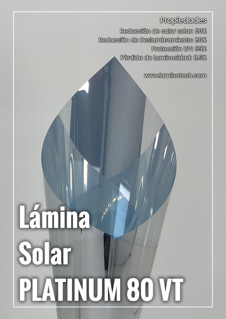 La lámina solar Platinum 80 VT reduce el deslumbramiento en un 80%; disminuyendo el exceso de luz que molesta a la visión y el reflejo en las pantallas. Y evita la decoloración de los elementos expuestos al sol, eliminando un 99% de los rayos UV.