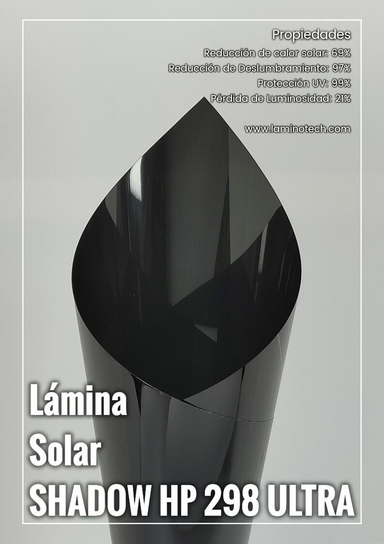 La lámina solar Shadow HP 298 Ultra es una lámina premium HP de intensidad muy fuerte, que permite una moderada transmisión de luz y fuerte rechazo solar del 69%.
