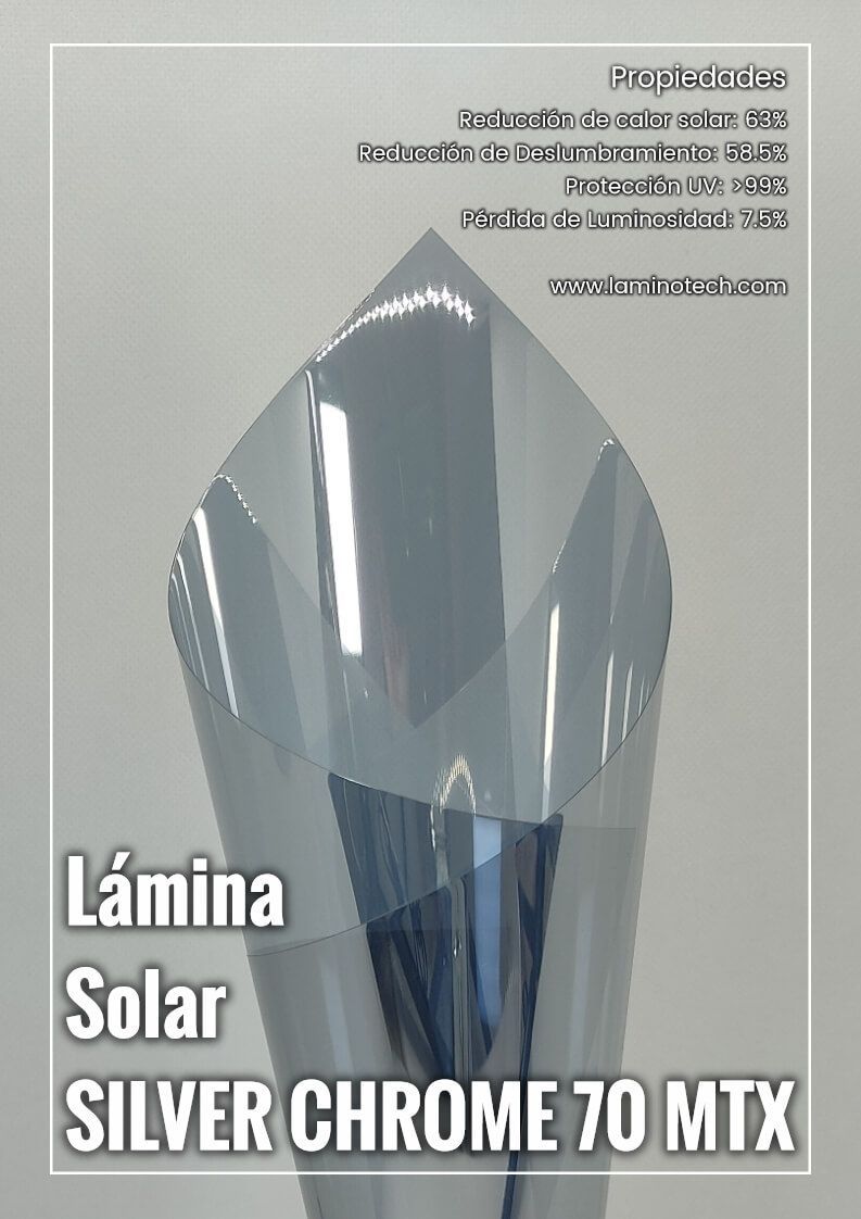 Compatibilidad, alto rendimiento y calidad son los atributos de la gama Silver Chrome para instalación por interior y exterior. Esta lámina solar Silver Chrome 70 MTX está indicada para proyectos donde se precise un elevado control del clima interior. Esta gama de lámina solar se encuentra en nuestro Top Ventas por calidad precio desde 2020.