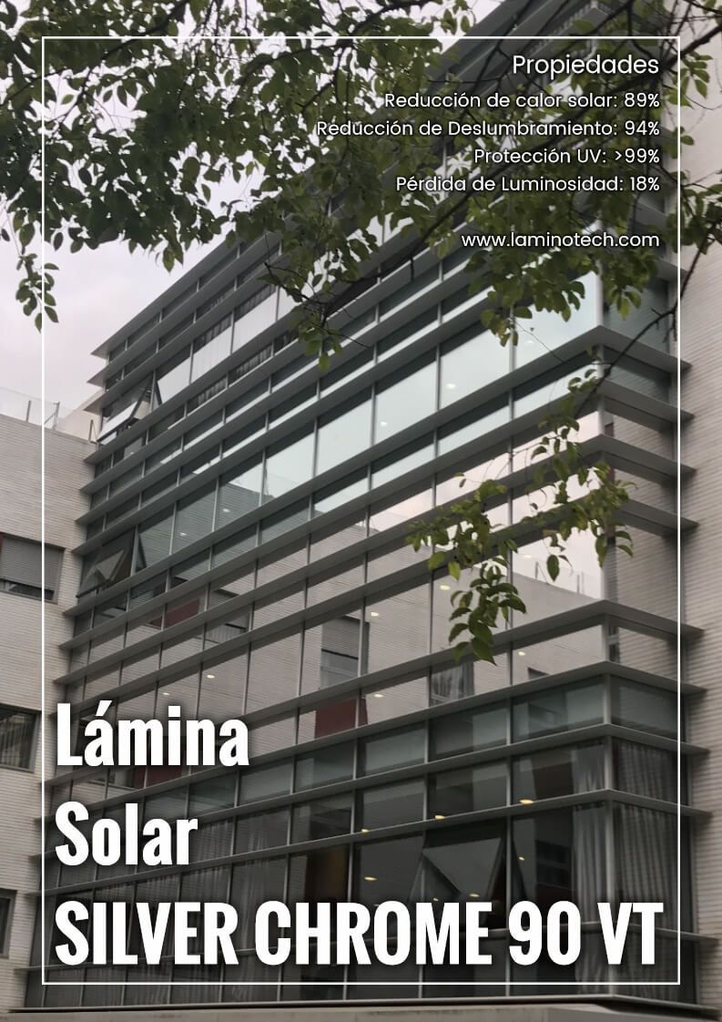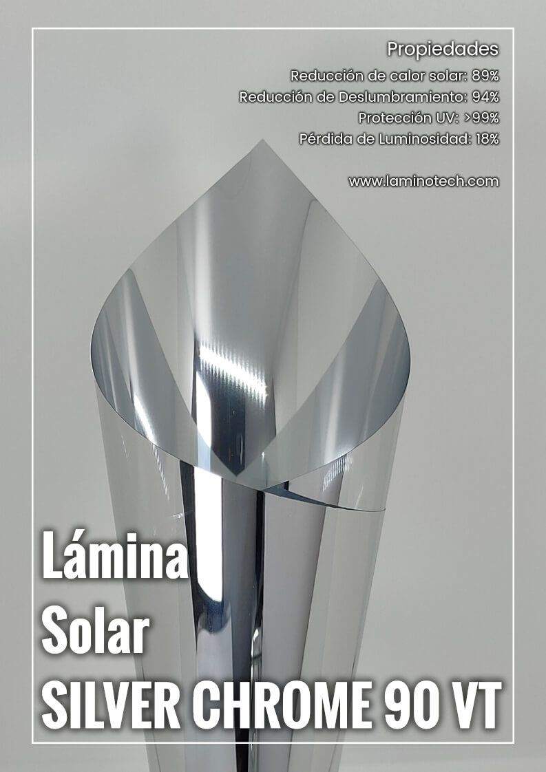 La lámina solar Silver Chrome 90 VT pertenece a la gama Silver Chrome de láminas solares metalizadas reflectivas, diseñadas para la máxima compatibilidad, eficiencia y calidad. Estas láminas son la opción más indicada para espacios y viviendas que necesitan una reducción de calor significativa. Con una garantía de 10 años y retorno de inversión rápido, es una de nuestras láminas de mayor rendimiento y eficiencia solar.