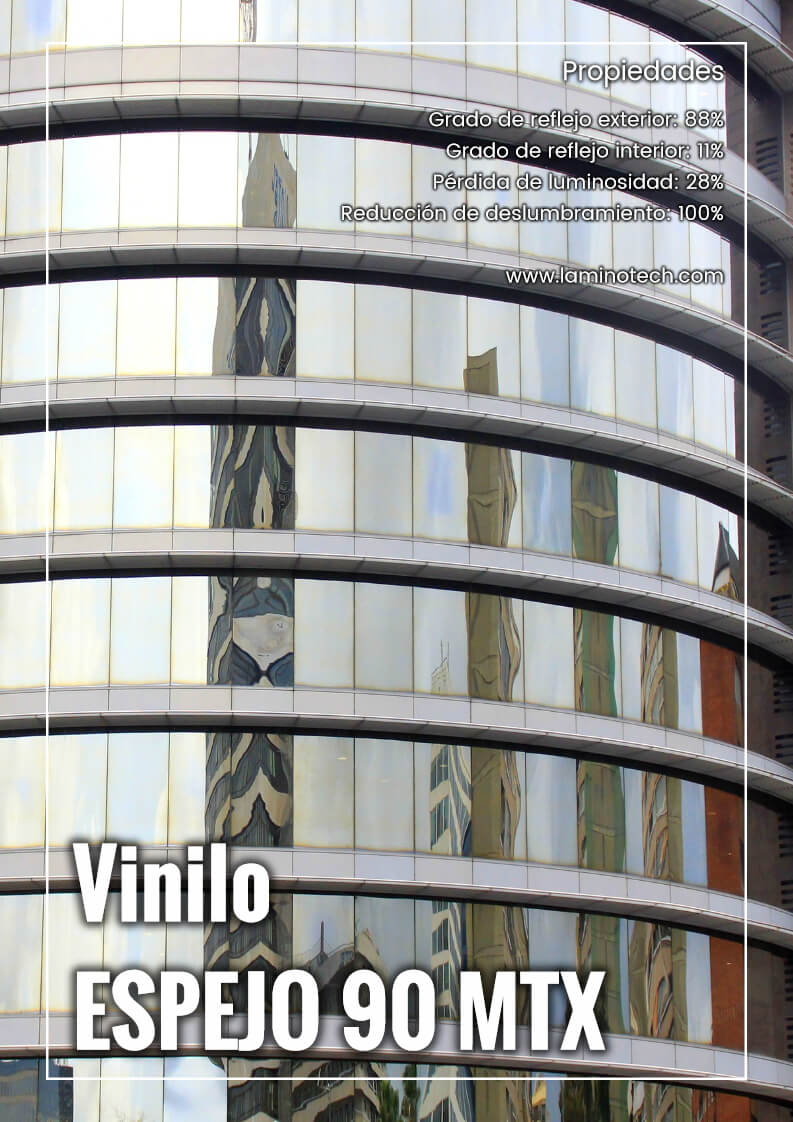 Nuestro vinilo Espejo 90 MTX es además una lámina de alta eficiencia térmica, con un alto rechazo solar del 99%. Esto se traduce en una reducción de 6 a 9 grados de temperatura, además de ser ideal para reducir los problemas de deslumbramiento.